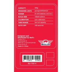 De Bull’s Pocket Scale beschikt over een duidelijk verlicht digitaal display, zodat metingen altijd goed leesbaar zijn – ook bij weinig licht. De weegschaal werkt op twee AAA-batterijen (niet inbegrepen) en levert professionele nauwkeurigheid in een handzaam formaat.