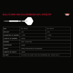 De Bull’s Dirk van Duijvenbode 80% Steeltip darts zijn ontworpen in samenwerking met de Nederlandse dartlegende Dirk van Duijvenbode. Deze darts combineren precisie, comfort en een aantrekkelijk prijskaartje, wat ze ideaal maakt voor zowel ambitieuze beginners als ervaren darters.
