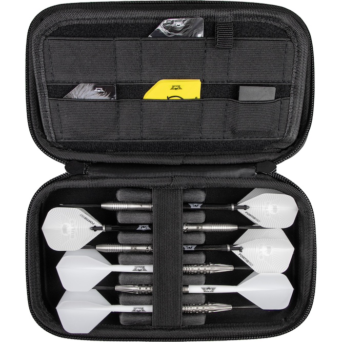 Binnenin is de Morph Case slim ingedeeld en biedt hij ruimte voor twee volledig gemonteerde dartsets, ook wanneer deze zijn uitgerust met moulded flights. Daarnaast zijn er extra compartimenten voor shafts en flights, en een afgesloten vak met ritssluiting voor kleinere accessoires zoals punten of ringen. Zo blijft alles goed beschermd, overzichtelijk opgeborgen en direct toegankelijk wanneer je het nodig hebt.