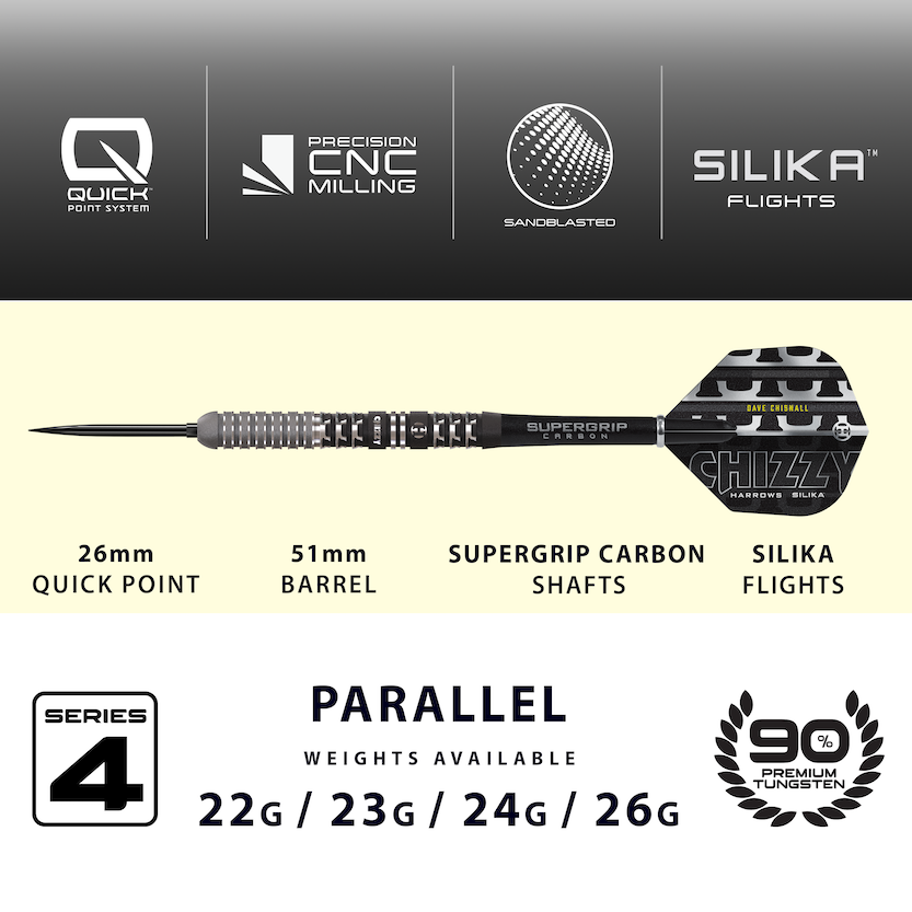 In samenwerking met Chisnall heeft Harrows een dart gecreëerd die zijn vertrouwde parallelle barrelprofiel behoudt, maar verfijnd is met een precisie-zandstraalcoating over de volledige lengte van de barrel. Deze grove textuur zorgt voor een uitzonderlijk consistente grip en een zuivere release, zelfs onder druk, waardoor spelers de volledige controle behouden tijdens hun worp.