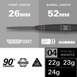In de set zijn de 26 mm gladde Swiss Points inbegrepen, die zijn uitgerust met een gepatenteerd vergrendelmechanisme, waardoor het wisselen van dartpunten moeiteloos gaat. De taper- en draadtechnologie zorgen voor een veilige en vergrendelde positie, wat stabiliteit en precisie tijdens elke worp garandeert. Gebruik de meegeleverde Swiss Point Tool voor een snelle tipwissel in enkele seconden.